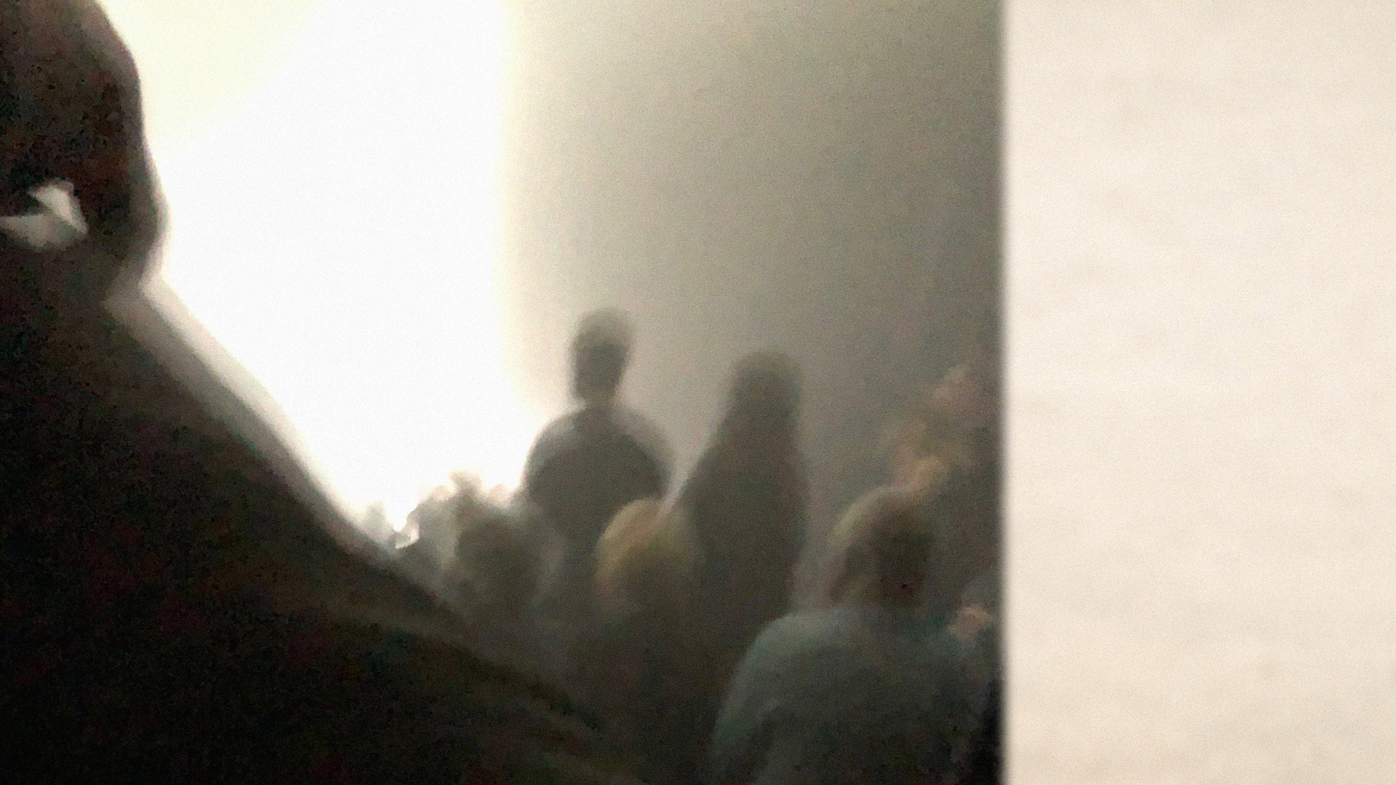 Eine dunkle, verschwommene Fotografie von von hinten fotografiertem Publikum.