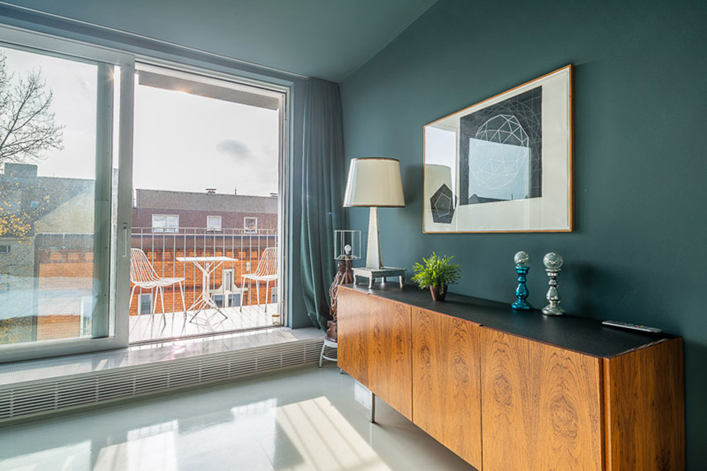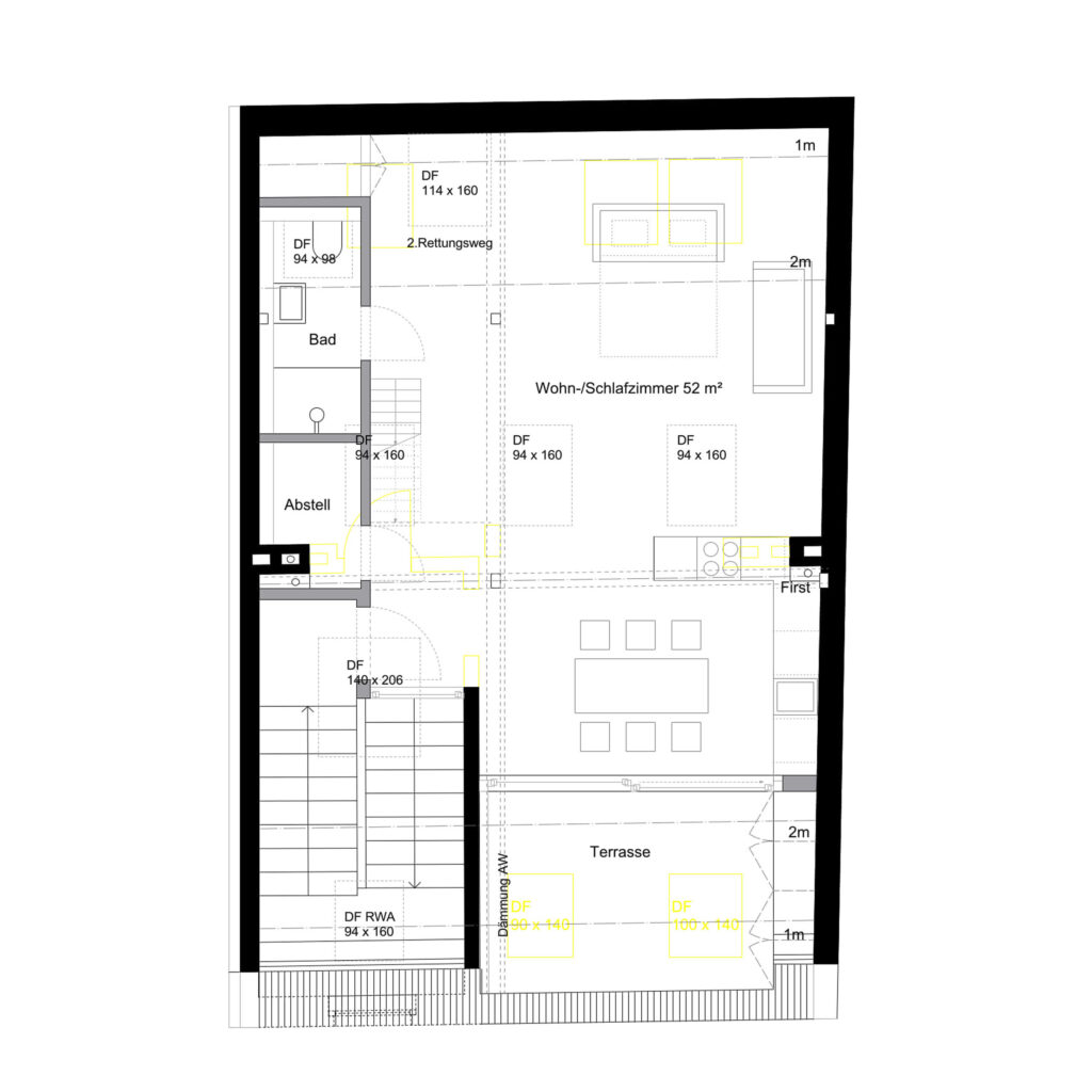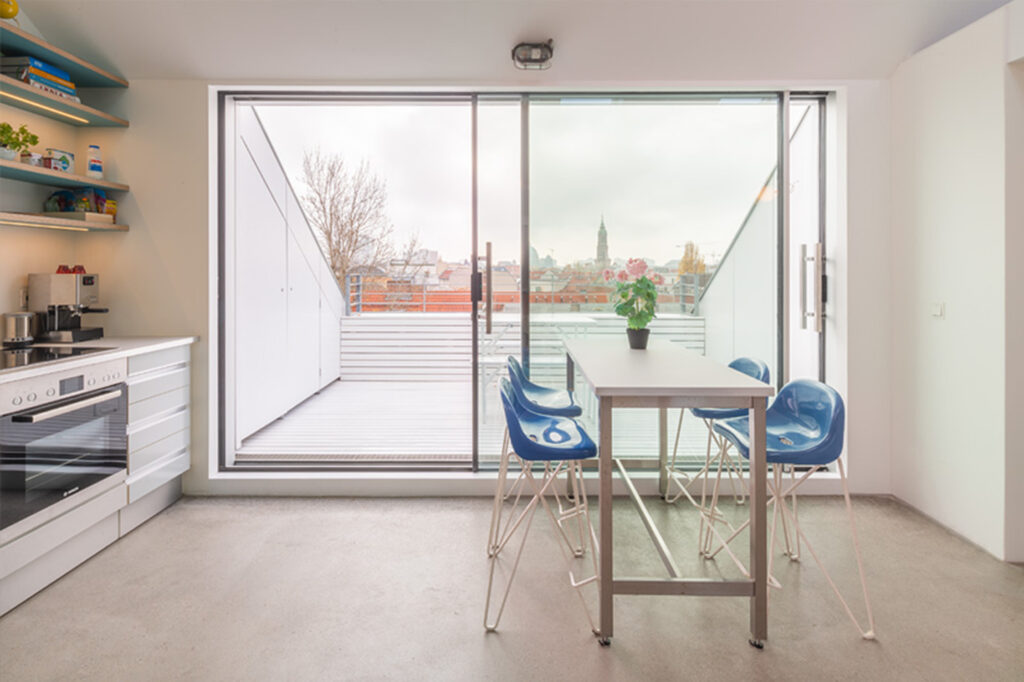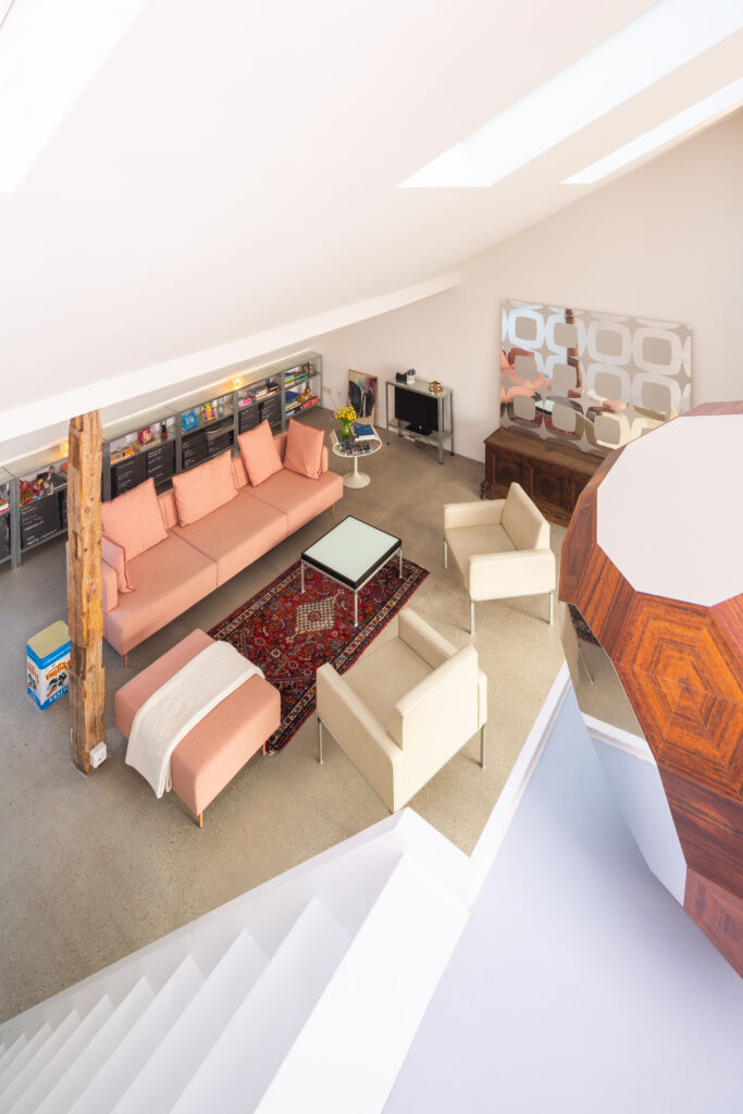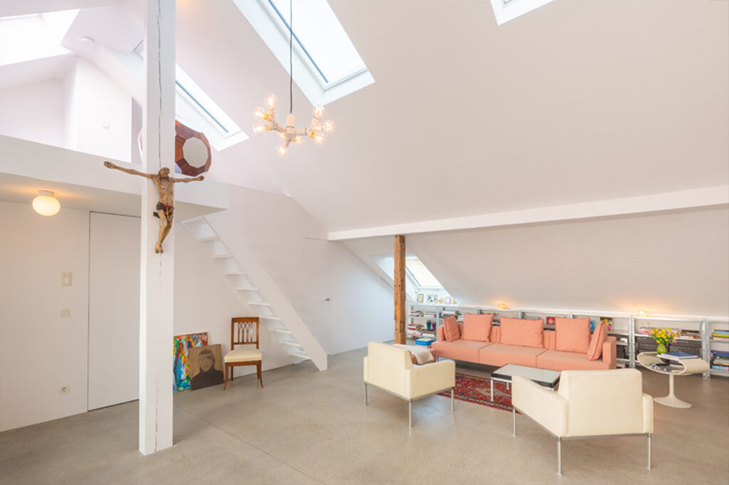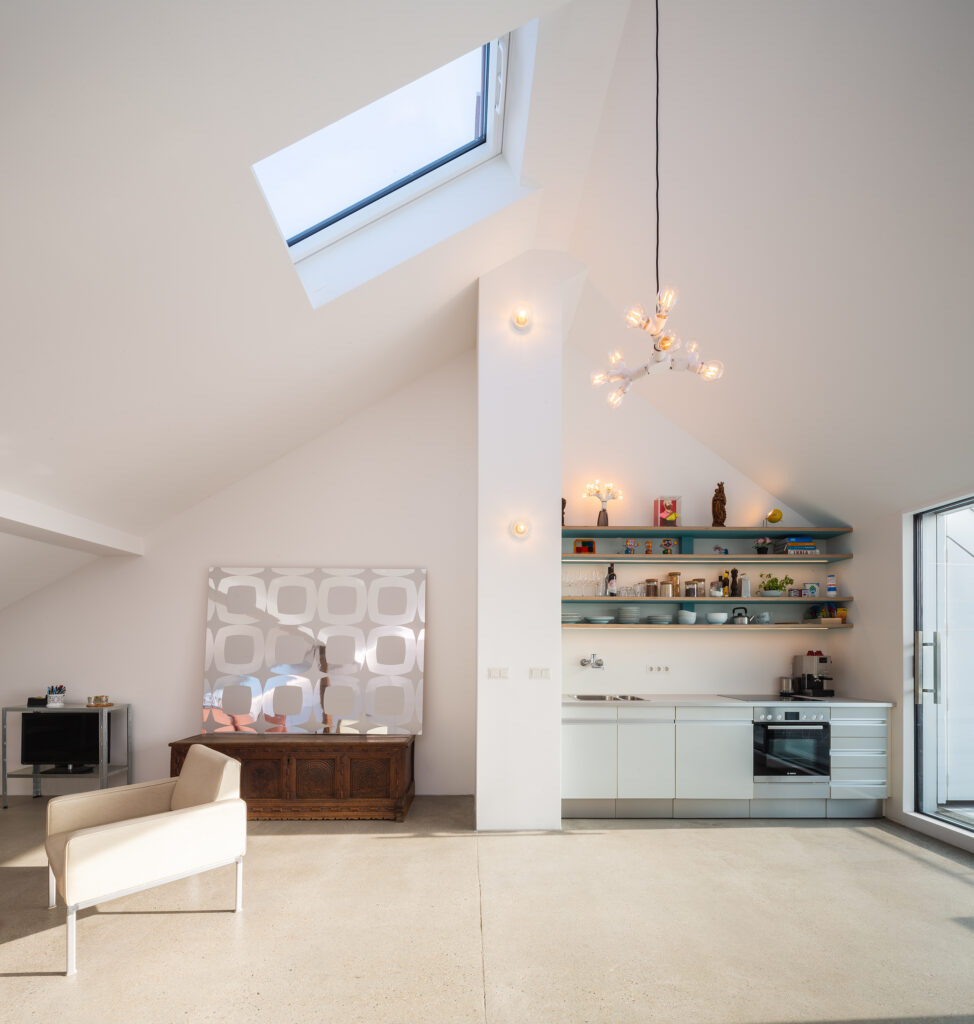 Die Aufenthaltsbereiche mit Wohnen, Schlafen, Küche und Bad befinden sich auf der Ebene des Dachgeschosses. Küche und Wohnraum gehen ineinander über und orientieren sich nach Süden zur Terrasse. Das Bad orientiert sich zur Nordfassade und wird über ein Dachflächenfenster natürlich belüftet. Die bestehende Empore wird durch den Einbau von Badezimmer und Abstellkammer in ihrer Fläche vergrößert und soll als Depot für Kunstwerke genutzt werden.