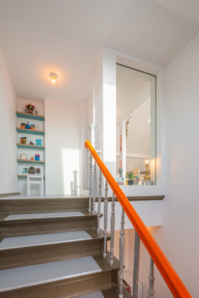 Zwischen Wohnraum und zugehöriger Empore wird eine Treppe eingebaut, es besteht Sicht- und Luftverbindung.