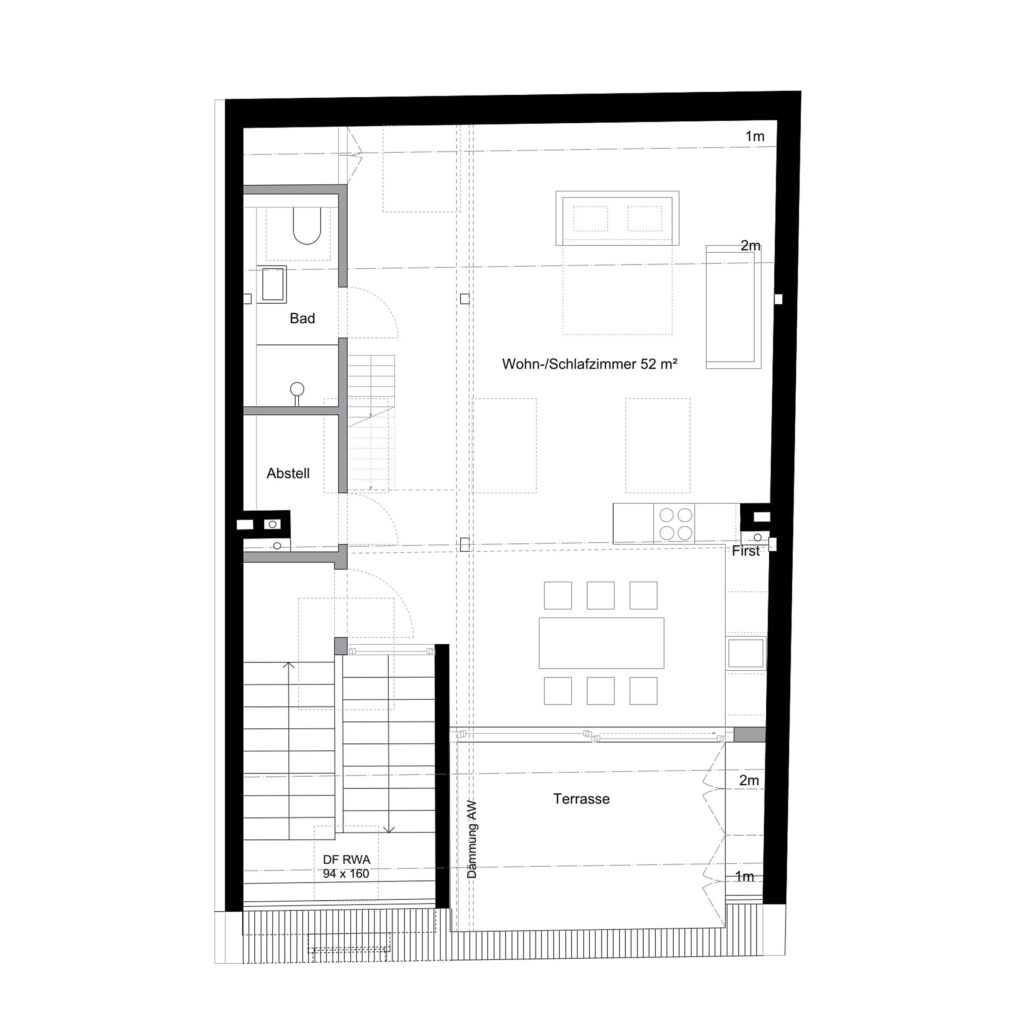 Durch den Umbau ist eine 1-Zimmer-Wohnung mit offener Küche, Empore, Badezimmer und Abstellkammer entstanden. Die Anzahl der Vollgeschosse wurde dadurch nicht verändert. Die Räumlichkeiten mit einer Bruttogeschossfläche von 105 m² sind nach Norden und Süden ausgerichtet.