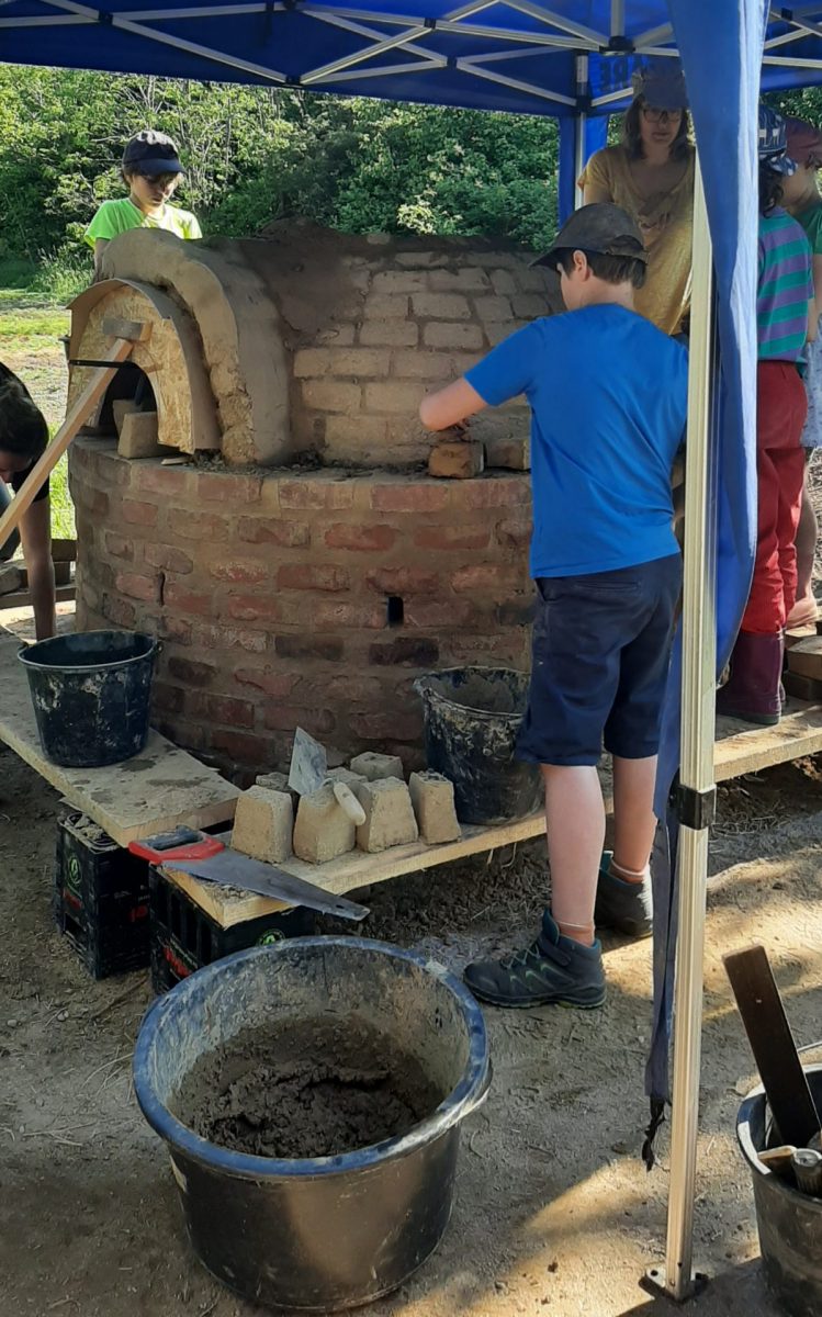 Bei schönstem Wetter waren die Schüler*innen eifrig am Gestalten. Es mussten alte Steine abgeklopft, neue Lehmsteine hergestellt werden und dann wurde am Ofen gemauert. In mehreren Kleingruppen lernten die Schüler*innen die verschiedenen Arbeitsschritte und Handgriffe kennen und machten erste Erfahrungen im Umgang mit unterschiedlichen Materialien und Werkzeugen. Im Sinne des „cradle to cradle Prinzips“ wurden bei diesem Projekt bewusst ressourcenschonende, wieder verwertbare und natürliche Baustoffe sowie Abbruchmaterial verwendet.