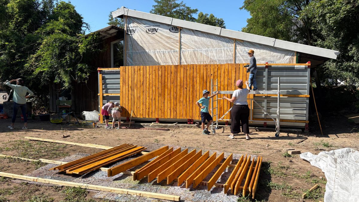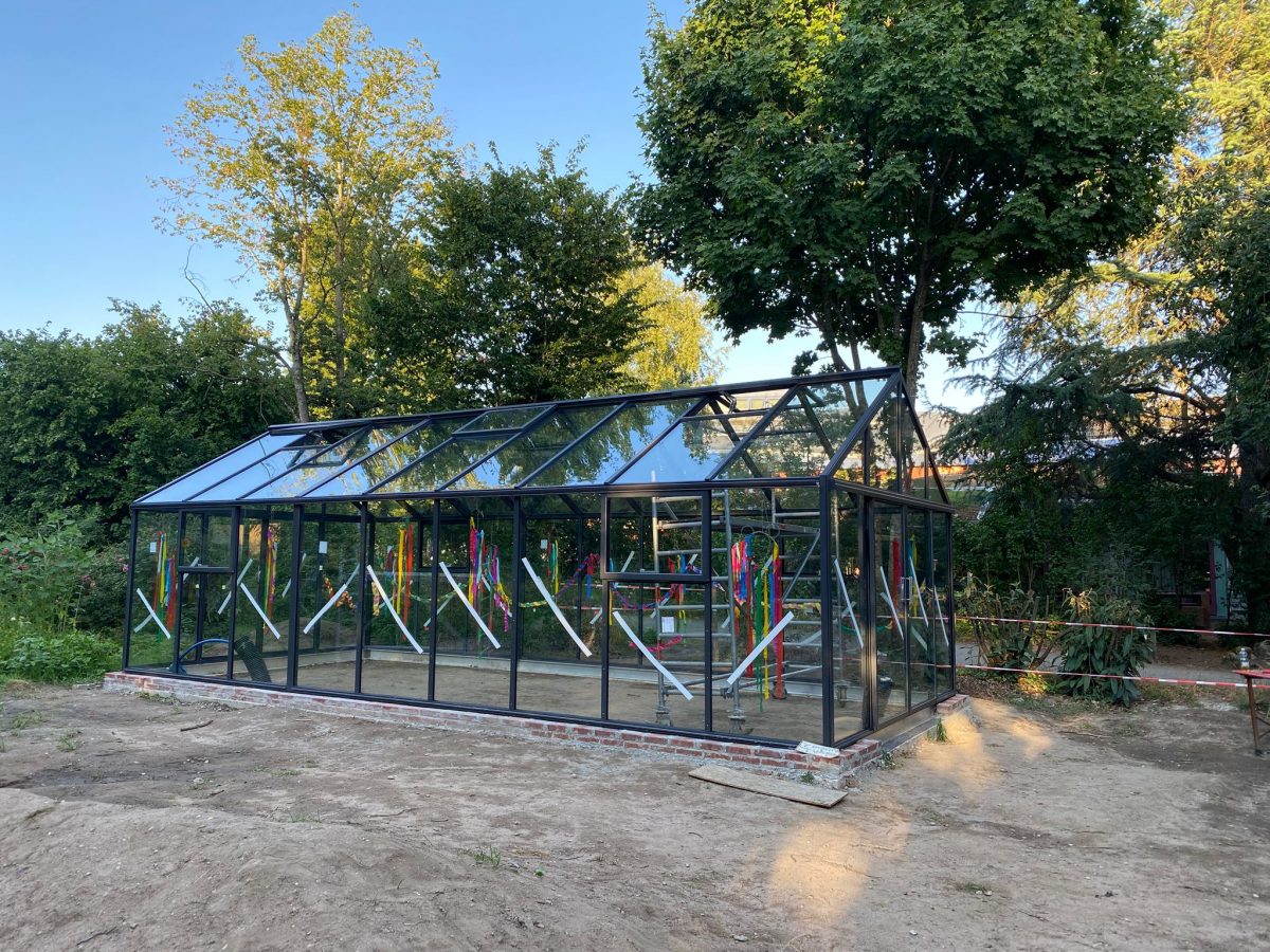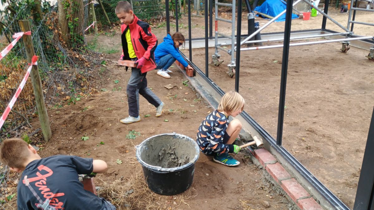 Zudem wurden zwei Baucontainer – ebenfalls auf dem Gartenbaugelände – mit zuvor zugesägten und gestrichenen Brettern ansprechend verkleidet. Allen Beteiligten – allen voran den Schüler*innen – hat die Arbeit an diesen zwei Bauprojekten jede Menge Freude gemacht und sie haben ganz viel gelernt. Besonders beim Mauern waren alle mit Eifer dabei, richteten Mörtel an, spannten Schnüre und setzten rote Klinker. Die Übergabe des Gewächshauses durch die damalige 3a an die Schulgemeinschaft hat mit einem schönen Fest stattgefunden. Jetzt liegt es in den Händen von Baugeschäftsführer Jochen Gaukel, an den Mitarbeitenden der Hausmeisterei sowie an Gartenbaulehrerin Martine Menrad, das „Innenleben“ des Gewächshauses fertigzustellen und das Glasgebäude in Betrieb zu nehmen.