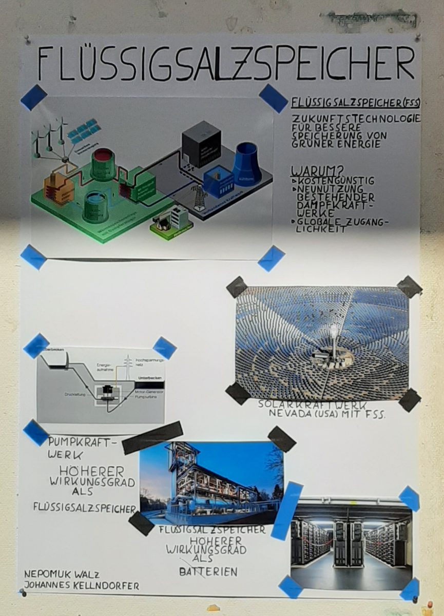 Nachdem sich die Parallelklasse bereits im Januar 2022 sehr intensiv mit der Nachhaltigkeit bei Lebensmittel beschäftigt hat, sind nun die Schüler*innen der Klasse 12a mit ihrer Lehrerin Frau King in vielen anderen Lebensbereichen auf die Suche nach ökologischer Zukunftsfähigkeit gegangen. Die Präsentation ihrer Ergebnisse wurde visuell sehr kreativ auf Plakaten herausgearbeitet, die Erläuterungen der Schüler*innen waren es nicht minder. Als Gäste waren die Klassen 11b und 8a eingeladen. Sie konnten sich in der Hauptunterrichtszeit erklären lassen, wie die Technik der Flüssigsalzspeicher als thermischer Energiespeicher funktioniert.